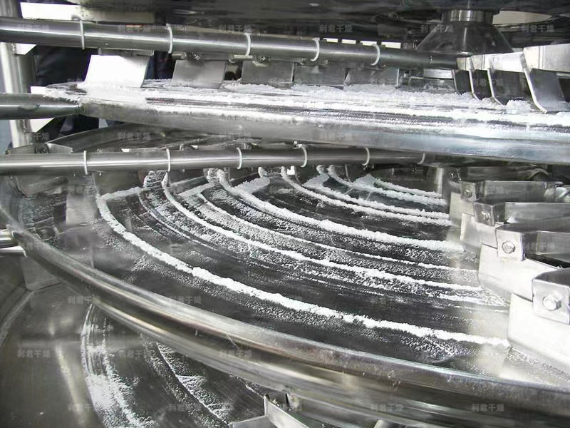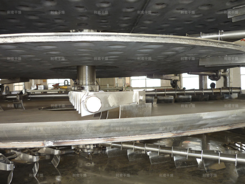濕物料自加料器連續(xù)地加到干燥器上部第一層干燥盤上,帶有耙葉的耙臂作回轉(zhuǎn)運動使耙臂作回轉(zhuǎn)運動使耙葉連續(xù)地翻抄物料。物料沿指數(shù)螺旋線流過干燥盤表面,在小干燥盤上的物料被移送到外緣,并在外緣落到下方的大干燥盤外緣,在大干盤上物料向里移動并從中間落料口落如下一層小干燥盤中。大小干燥盤上下交替排列,物料得以連續(xù)地流過整個干燥器。中空的干燥盤內(nèi)通入加熱介質(zhì),加熱介質(zhì)形式有飽和蒸汽、熱水和導(dǎo)熱油,加熱介質(zhì)由干燥盤的一端進(jìn)入,從另一端導(dǎo)出。已干物料從最后一層干燥盤落到殼體的底層,最后被耙葉移送到出料口排出。濕份從物料中逸出,由設(shè)在頂蓋上的排濕口排出,真空型盤式干燥器的濕氣由設(shè)在頂蓋上的真空泵口排出。從底層排出的干物料可直接包裝。通過配加翅片加熱器、溶劑回收冷凝器、袋式除塵器、干料返混機(jī)構(gòu)、引風(fēng)機(jī)等輔機(jī),可提高其干燥的生產(chǎn)能力,干燥膏糊狀和熱敏性物 料,可方便地回收溶劑,并能進(jìn)行熱解和反應(yīng)操作。
