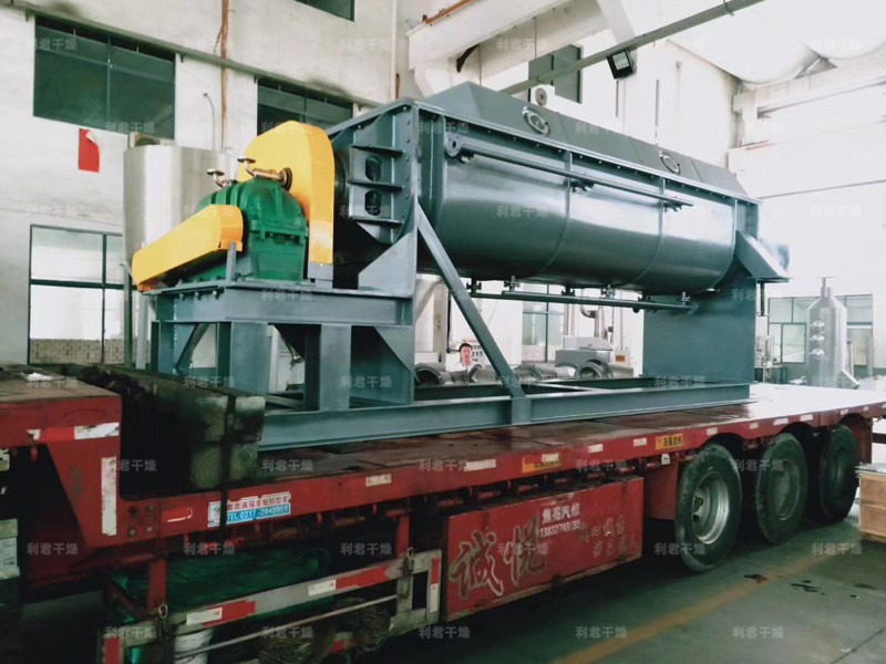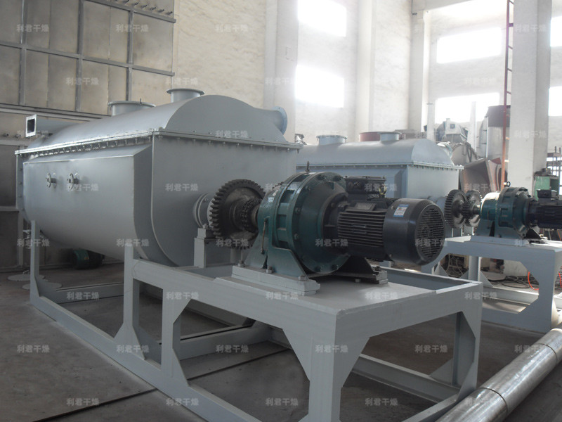 空心軸上密集排列著楔型中空漿葉,熱介質(zhì)經(jīng)空心軸流經(jīng)漿葉。單位有效容積內(nèi)傳熱面積很大,熱介質(zhì)溫度從-40℃到320℃,可以是水蒸汽,也可以是液體型:如熱水、導(dǎo)熱油等。間接傳導(dǎo)加熱,沒有攜帶空氣帶走熱量,熱量均用來(lái)加熱物料。熱量損失僅為通過器體保溫層向環(huán)境的散熱。楔型漿葉傳熱面具有自清潔功能。物料顆粒與楔型面的相對(duì)運(yùn)動(dòng)產(chǎn)生洗刷作用,能夠洗刷掉楔型面上附著物料,使運(yùn)轉(zhuǎn)中一直保持著清潔的傳熱面。漿葉干燥機(jī)的殼體為Ω型,殼體內(nèi)一般安排二到四根空心攪拌軸。殼體有密封端蓋與上蓋,防止物料粉塵外泄而充分發(fā)揮作用。
