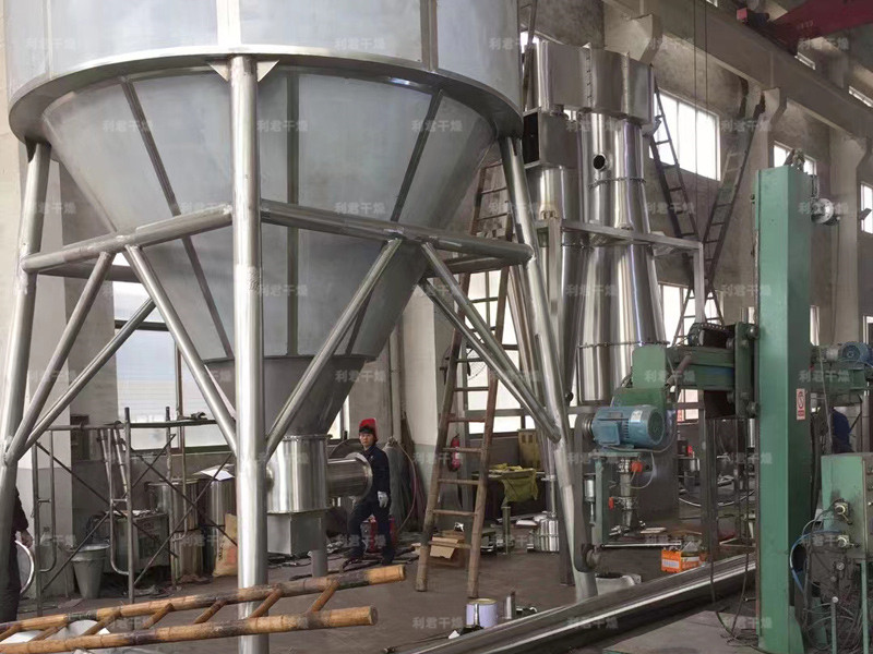 空氣經(jīng)過(guò)濾和加熱,進(jìn)入干燥器頂部空氣分配器,熱空氣呈螺旋狀均勻地進(jìn)入干燥室。料液經(jīng)塔體頂部的高速離心霧化器,(旋轉(zhuǎn))噴霧成極細(xì)微的霧狀液珠,與熱空氣并流接觸在極短的時(shí)間內(nèi)可干燥為成品。成品連續(xù)地由干燥塔底部和旋風(fēng)分離器中輸出,廢氣由風(fēng)機(jī)排空。