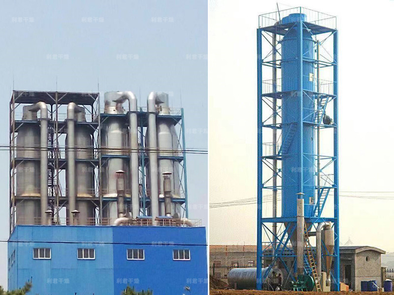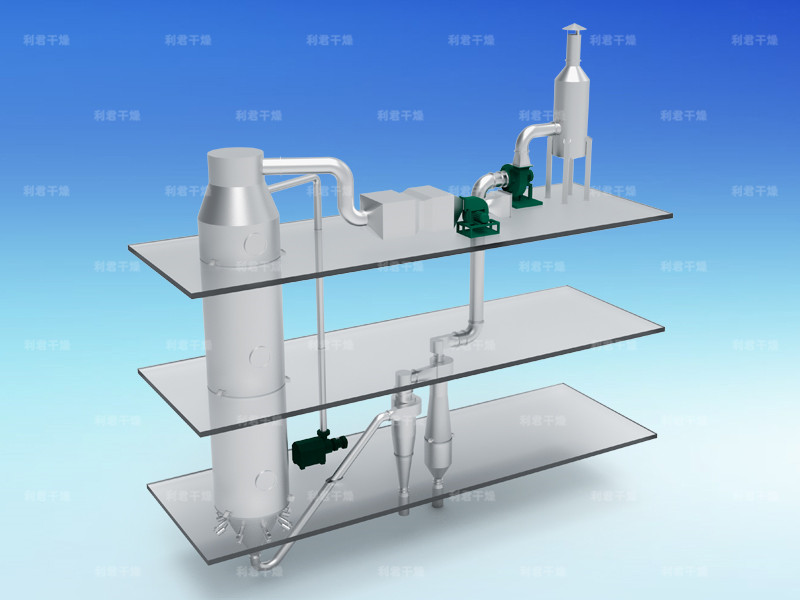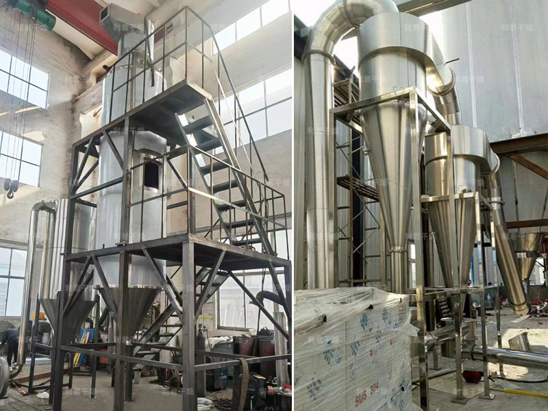 本機(jī)組工作過(guò)程為料液通過(guò)隔膜泵高壓輸入,噴出霧狀液滴,然后同熱空氣并流下降,大部分粉粒由塔底排料口收集,廢氣及其微小粉末經(jīng)旋風(fēng)分離器分離,廢氣由抽風(fēng)機(jī)排出,粉末由設(shè)在旋風(fēng)分離器下端的授粉筒收集,風(fēng)機(jī)出口還可裝備二級(jí)除塵裝置,回收率在96-98%以上。