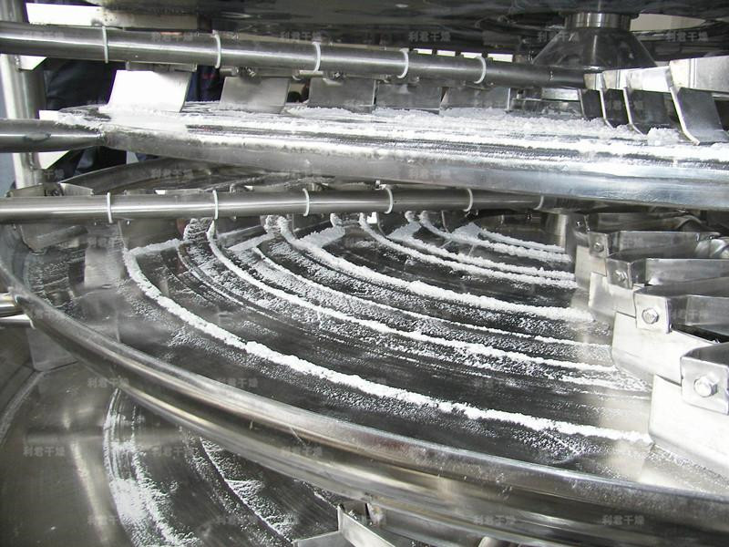 濕物料自加料器連續(xù)地加到干燥器上部第一層干燥盤上,帶有耙葉的耙臂作回轉(zhuǎn)運(yùn)動使耙臂作回轉(zhuǎn)運(yùn)動使耙葉連續(xù)地翻抄物料。物料沿指數(shù)螺旋線流過干燥盤表面,在小干燥盤上的物料被移送到外緣,并在外緣落到下方的大干燥盤外緣,在大干盤上物料向里移動并從中間落料口落如下一層小干燥盤中。大小干燥盤上下交替排列,物料得以連續(xù)地流過整個干燥器。中空的干燥盤內(nèi)通入加熱介質(zhì),加熱介質(zhì)形式有飽和蒸汽、熱水和導(dǎo)熱油,加熱介質(zhì)由干燥盤的一端進(jìn)入,從另一端導(dǎo)出。已干物料從最后一層干燥盤落到殼體的底層,最后被耙葉移送到出料口排出。濕份從物料中逸出,由設(shè)在頂蓋上的排濕口排出,真空型盤式干燥器的濕氣由設(shè)在頂蓋上的真空泵口排出。從底層排出的干物料可直接包裝。通過配加翅片加熱器、溶劑回收冷凝器、袋式除塵器、干料返混機(jī)構(gòu)、引風(fēng)機(jī)等輔機(jī),可提高其干燥的生產(chǎn)能力,干燥膏糊狀和熱敏性物 料,可方便地回收溶劑,并能進(jìn)行熱解和反應(yīng)操作。